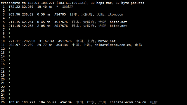 | 1 | 183.61.109.221 | 中国广东广州 chinatelecom.com.cn 电信 | AS4134 | 0.2 / 0.4 / 39.6 |