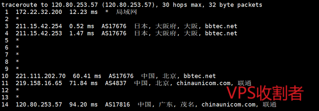 | 4 | 120.80.253.101 | 中国广东茂名 chinaunicom.com 联通 | AS17816 | 1.5 / 10.1 / 50.3 |
