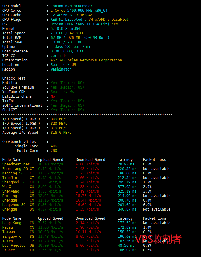 网络方面:电信联通去程直连,移动去程CMI,回程由于商家设置了全局出口为美国家宽IP,无法得知路由情况。