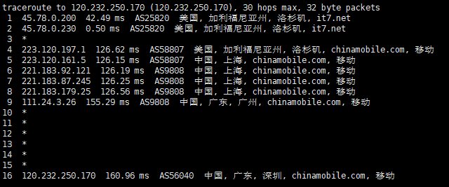 | 12 | 223.120.161.6 | 美国加利福尼亚州洛杉矶 chinamobile.com 移动 | AS58807 / AS9808 | 164.2 / 164.2 / 165.6 |