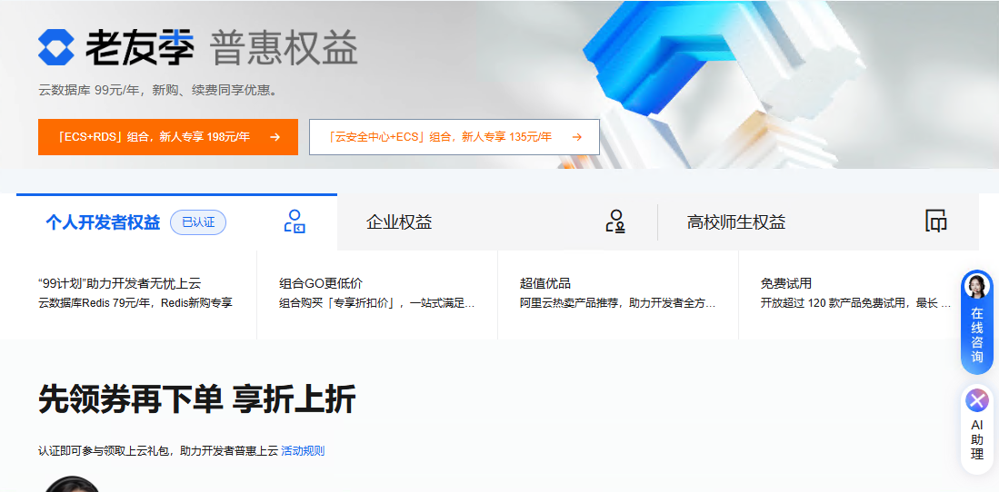老用户可以选择99元ECS云服务器,活动期间新购、续费同价,开发必备!