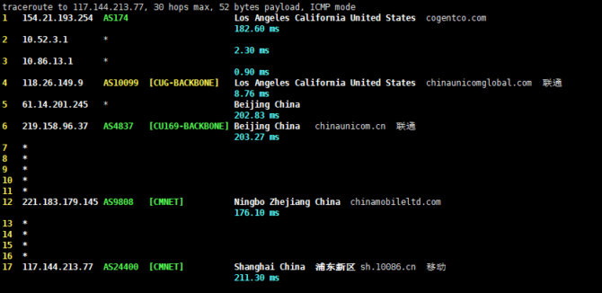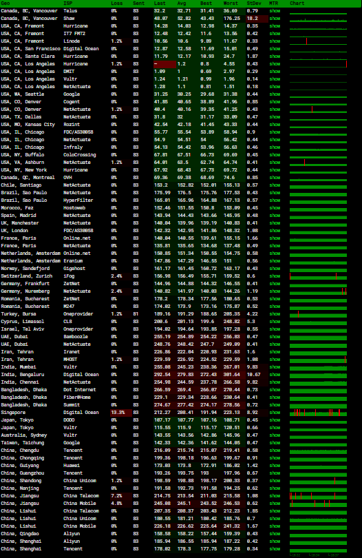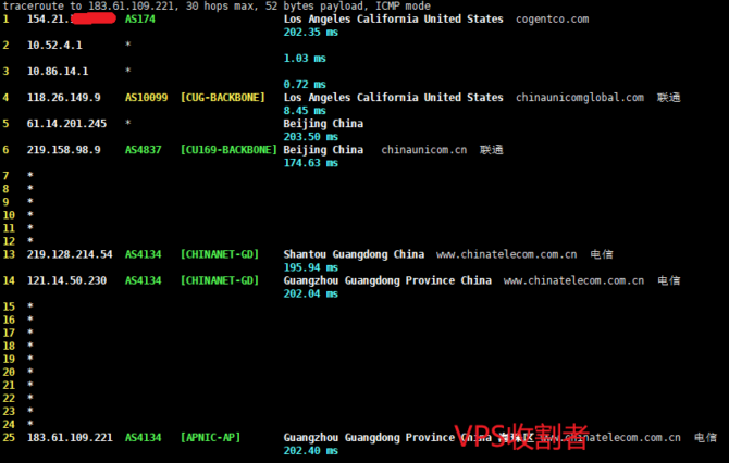 | 16 | 154.24.31.138 | 美国加利福尼亚州洛杉矶 cogentco.com | AS174 | 178 / 178.9 / 182.5 |