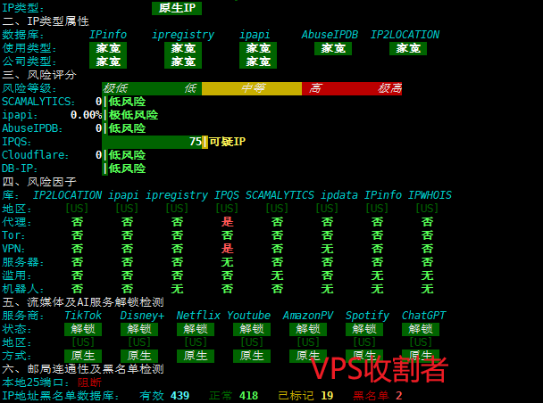 IP质量检测结果均为双ISP,家宽原生IP,低风险IP,仅有IPQS一项不太理想。很适合用于访问风控比较严格的服务,如tiktok,做一个云上美国人。