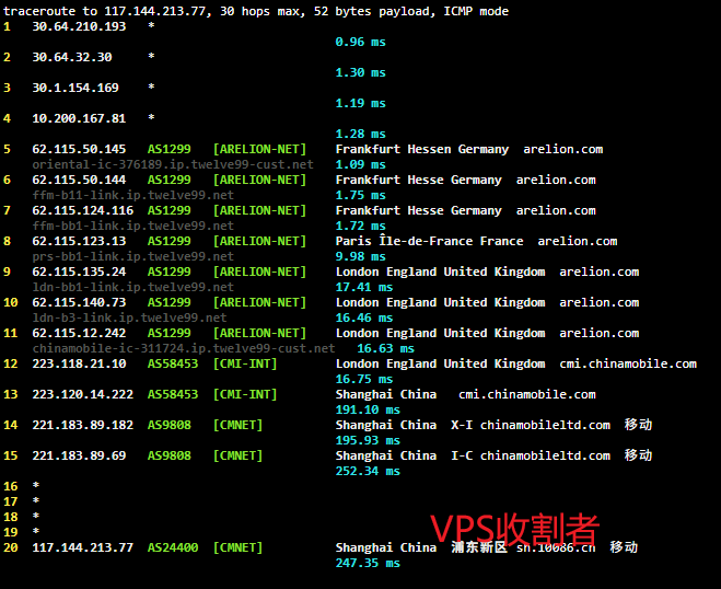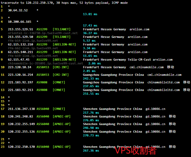 | 21 | 62.115.122.139 | 德国黑森州法兰克福 telia.com | AS1299 | 251.9 / 252.1 / 252.4 |