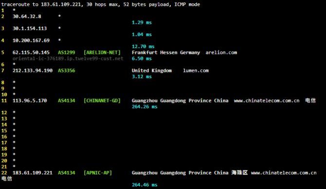 | 12 | 62.115.132.209 | 德国黑森州法兰克福 telia.com | AS1299 | 180.4 / 181.7 / 183 |