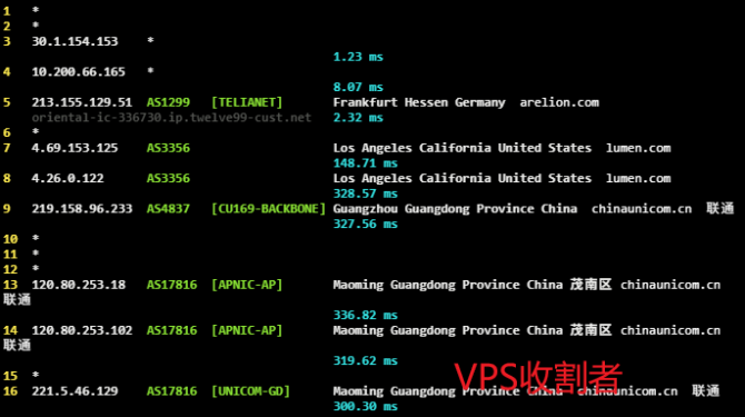 | 14 | 62.115.185.212 | 美国加利福尼亚州洛杉矶 telia.com | AS1299 | 158.6 / 159.3 / 159.6 |