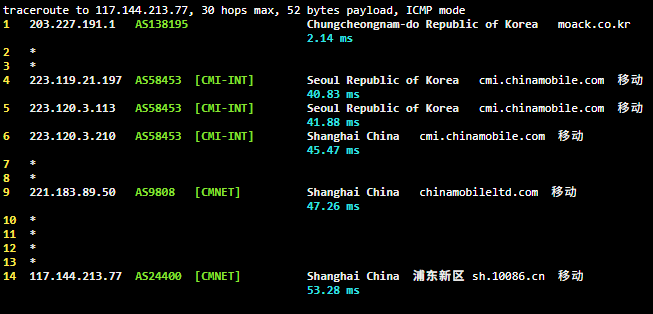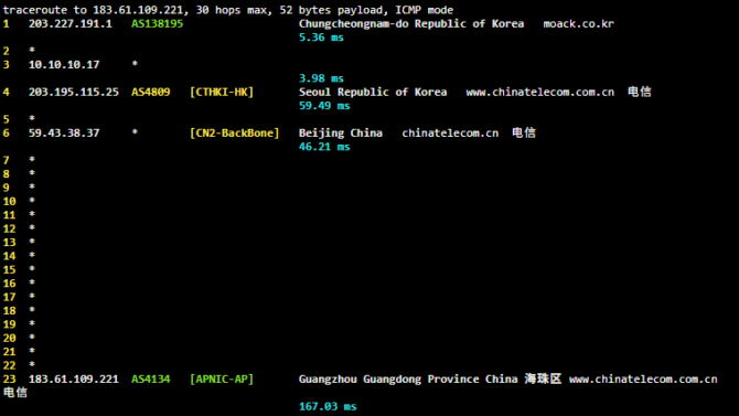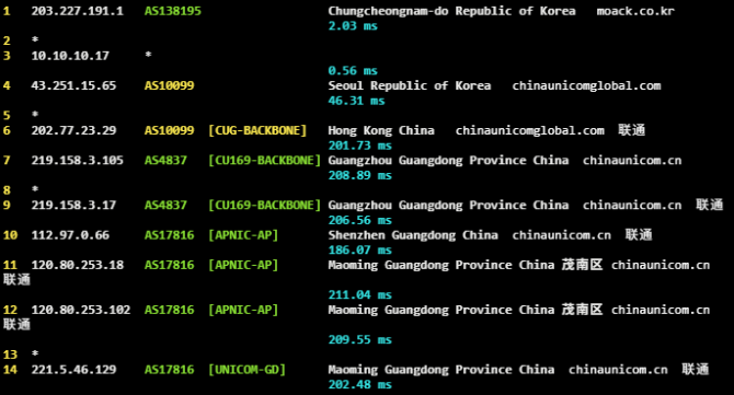 | 18 | 203.227.*.* | 韩国首尔 sejongtelecom.net | AS9848 | 212.5 / 213.8 / 215.8 |