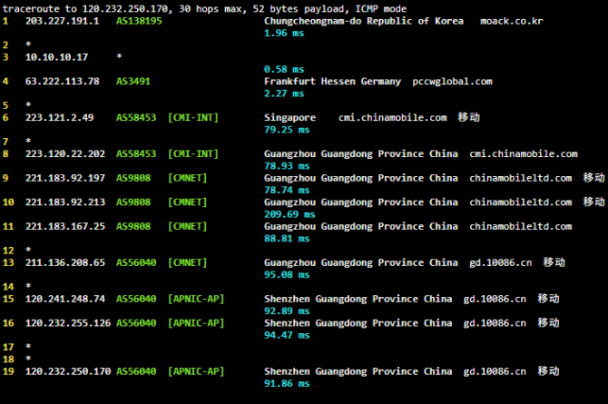 | 8 | 221.183.55.81 | 中国广东广州 chinamobile.com 移动 | AS9808 | 17.1 / 17.5 / 19.3 |