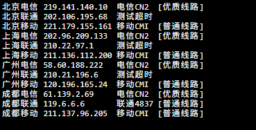 | 华北地区 | 北京移动 78ms | 内蒙古移动 97ms | 89ms |