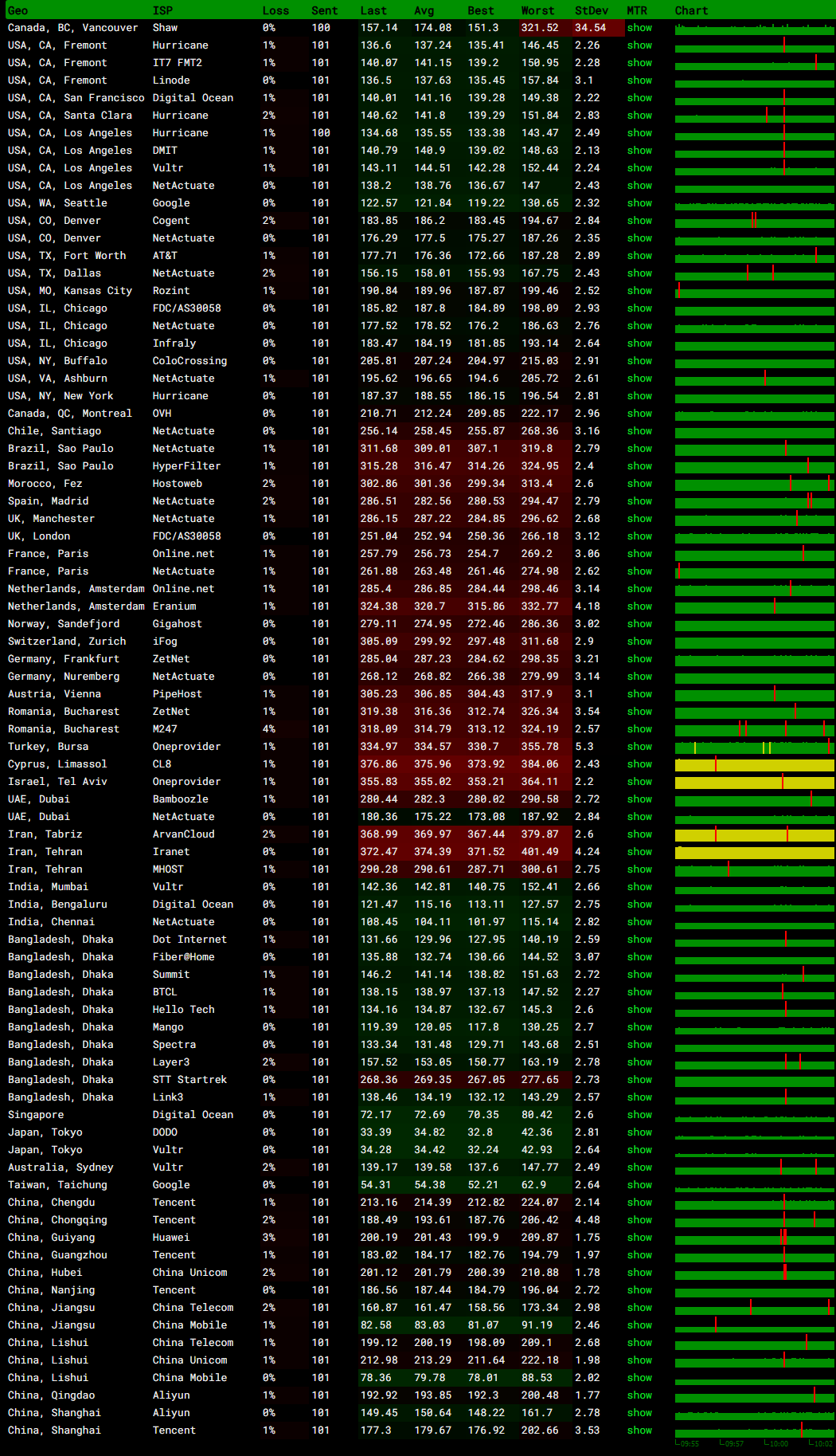 | 10 | 63.220.66.167 | 韩国首尔 pccw.com | AS3491 / AS31713 | 171.5 / 171.8 / 184.7 |