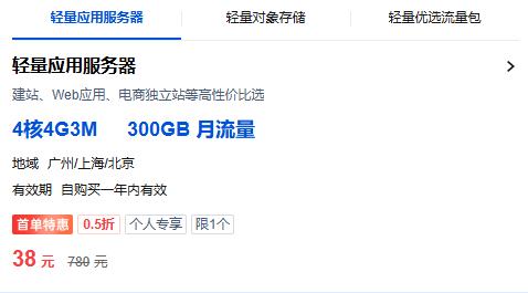 腾讯云4核4G3M轻量应用服务器¥38/年限时限量抢购,可选北京、上海和广州地区