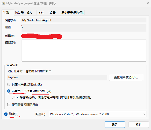 3.3 创建名为“MyNodeQueryAgent”的“计划任务”,设置为系统启动时运行,并勾选“隐藏”、选择“不管用户是否登录都要运行”。