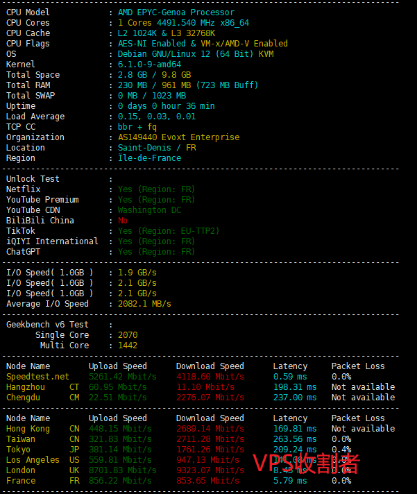 这里以VM-1套餐,1核1G配置为例,Geekbench v6 单核2070分,相当给力。