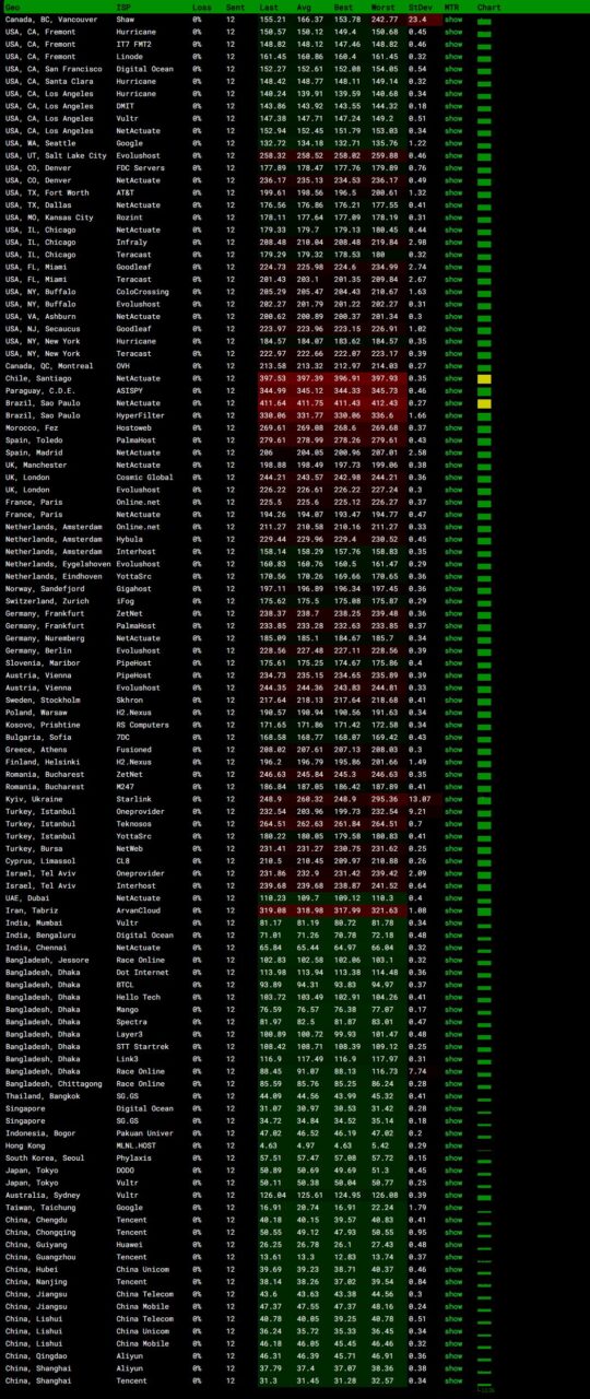 下图是使用 ping.pe 专业延迟与丢包工具进行测结果。