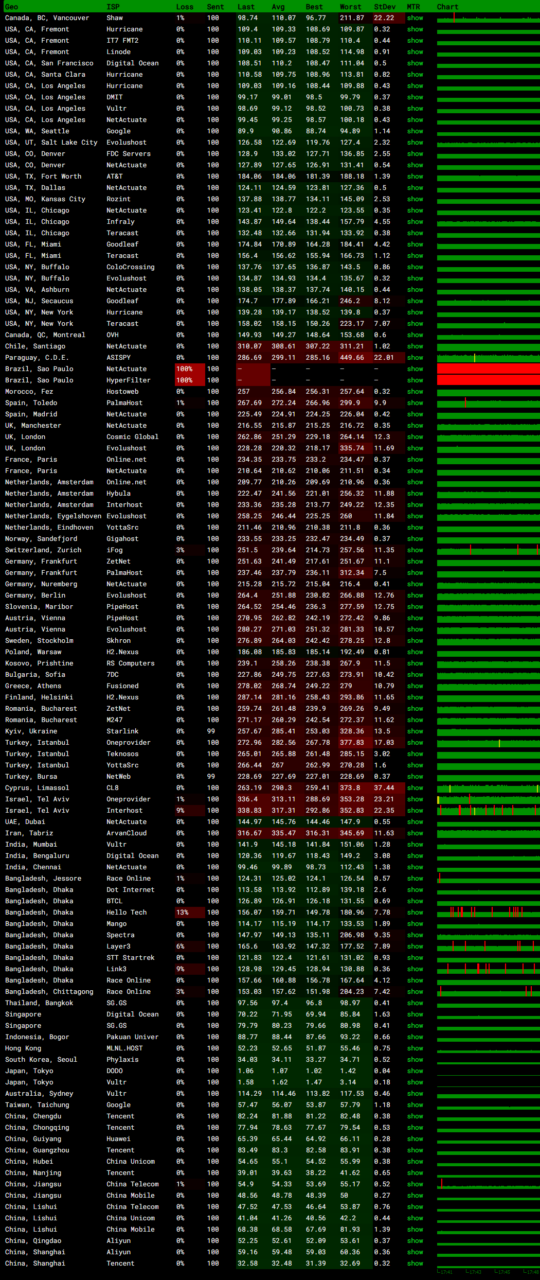 | 14 | 129.250.7.14 | 日本东京都东京 ntt.com | AS2914 | 256.4 / 269 / 307.2 |