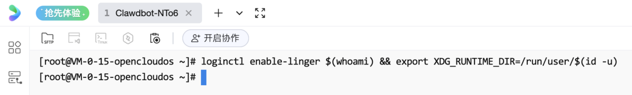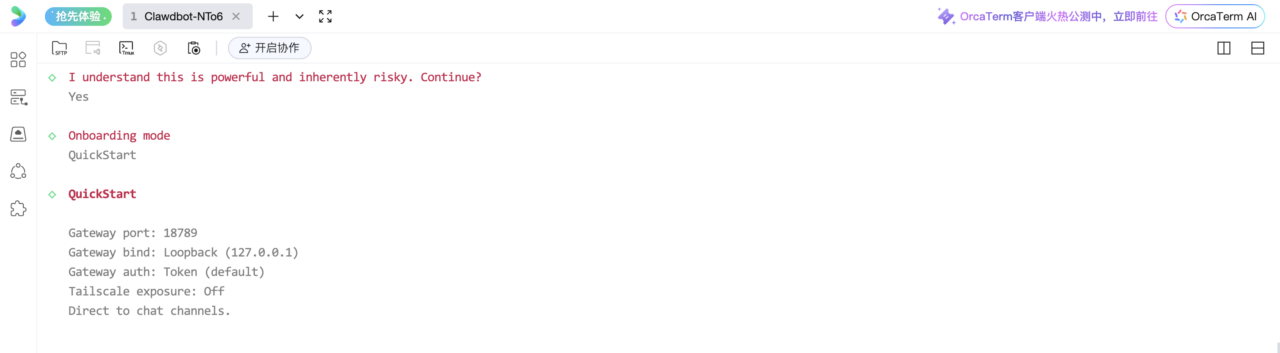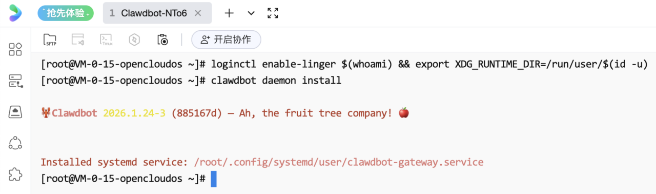 问题的原因是因为前面步骤中运行的命令,都只是“临时运行”,所以这里我们需要在前置的配置完成后,让Moltbot(Clawdbot)运行在后台,这样的话我们关掉服务器命令行页面(OrcaTerm)后就不会和它失去联系了。