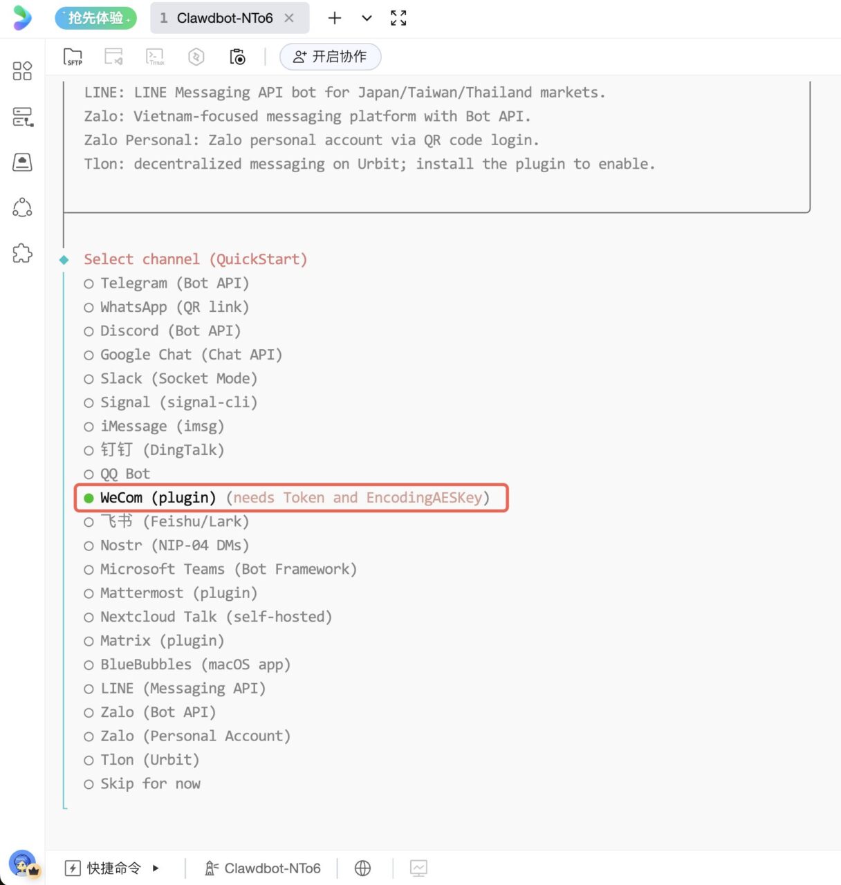 这一步将决定后续在什么界面下与Moltbot进行交互,目前我们已经提供了近10余款主流即时通讯IM软件的接入教程(持续更新中),并且独家首发了企业微信、QQ、钉钉、飞书四大主流国内IM软件的接入。