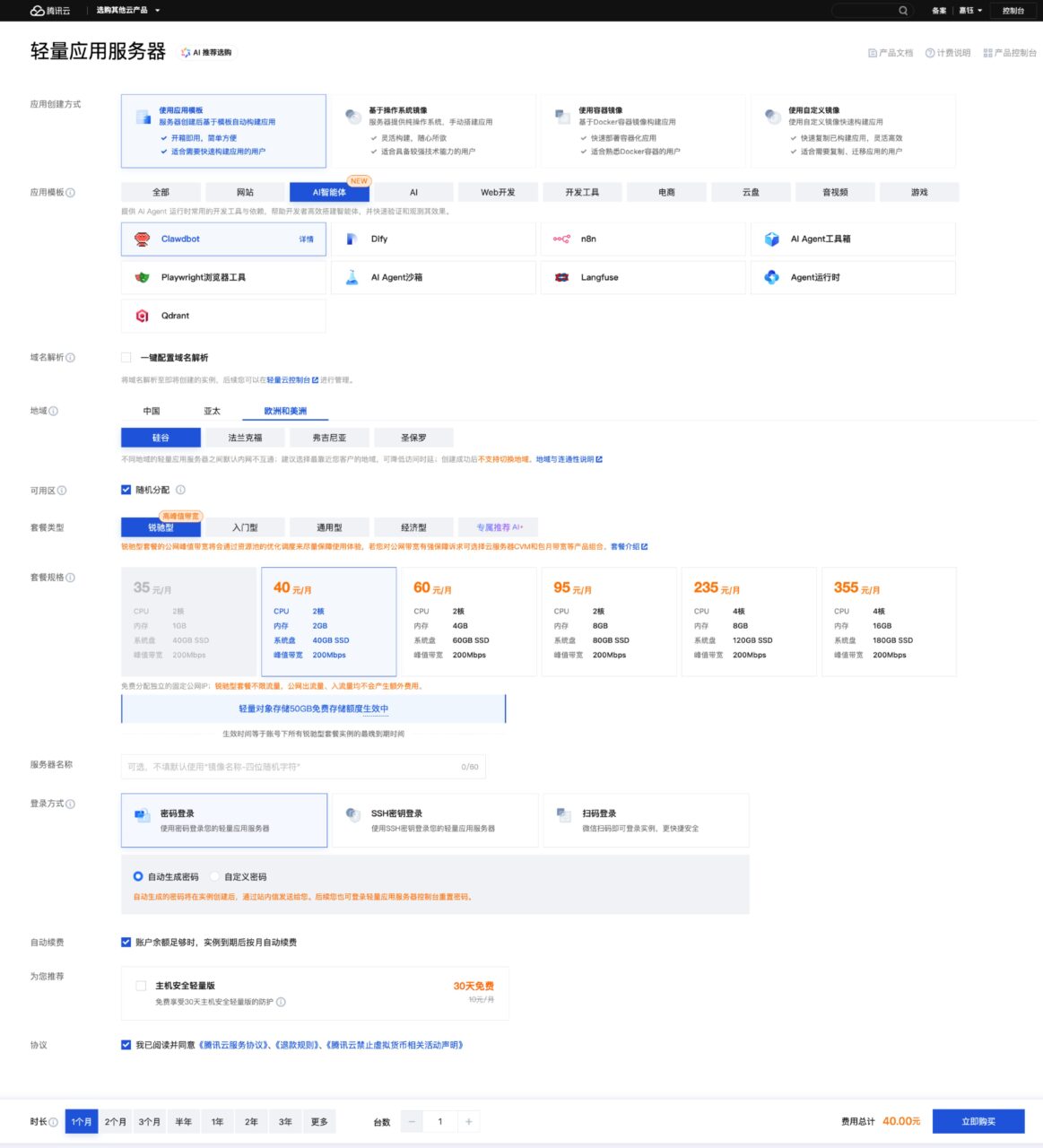 前往Lighthouse购买页,配置项按照下图直接选择即可,或者前往专属Moltbot活动页下单。