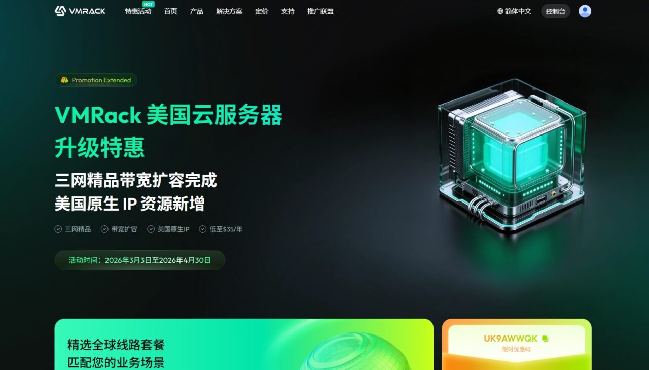 VMRack 春季活动:美国美国洛杉矶VPS限时8折优惠,活动周期为 2026 年 3 月 3 日至 4 月 30 日,三网精品云服务器(CN2 GIA/AS9929/CMIN2)年付低至 $35 起,分配美国原生IP,纯净度高,适合对IP质量要求较高的场景。常规套餐使用优惠码 UK9AWWQK 新购可享受 8 折优惠。