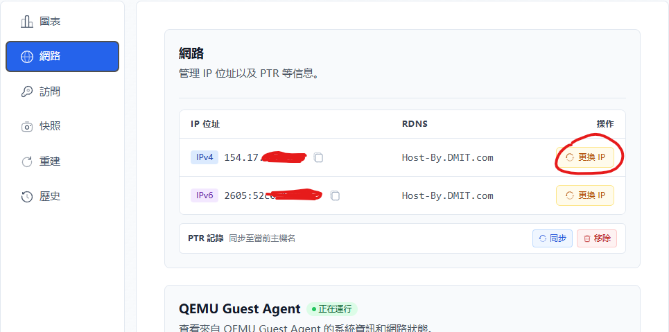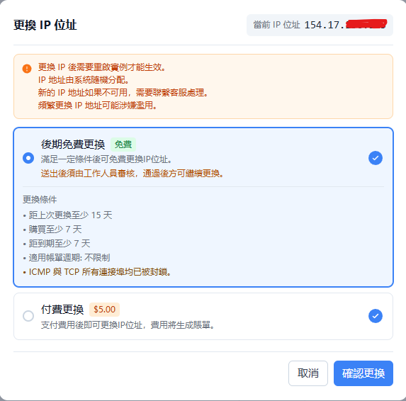 目前商家 全部 VPS 产品线 已开放后台自助更换 IP 功能,用户可以直接在控制面板提交申请,无需再通过工单处理。