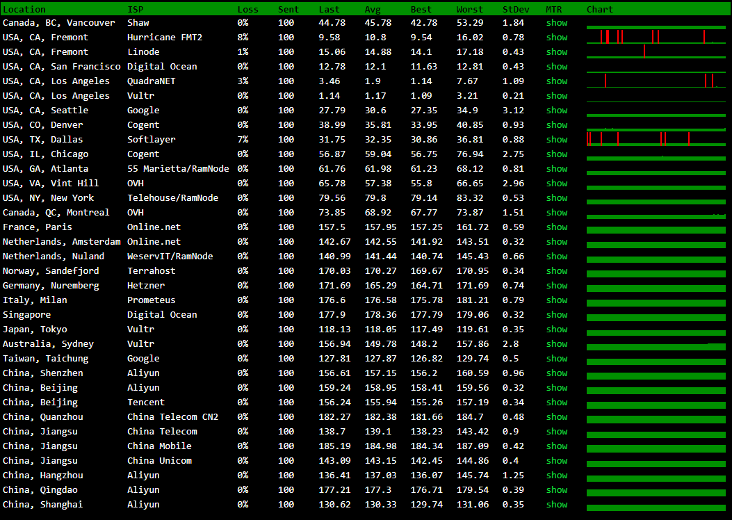 | 线路 | 最快节点 | 最慢节点 | 平均响应 |