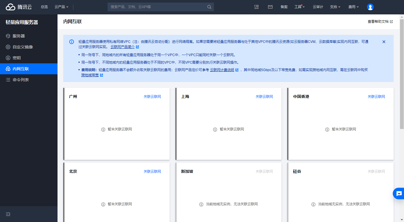 - 同一账号下,不同地域内的轻量应用服务器处于不同的VPC中,不同VPC需要分别执行关联云联网操作。