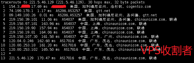 | 12 | 154.3.*.* | 美国加利福尼亚州洛杉矶 cogentco.com | * | 194.1 / 194.1 / 194 |