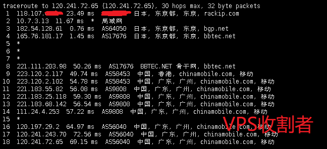| 15 | 221.183.55.81 | 中国广东广州 chinamobile.com 移动 | AS9808 | 11.7 / 10.9 / 10.9 |