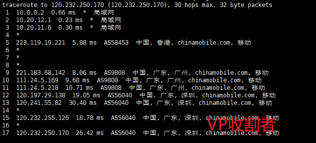 | 9 | 221.176.24.58 | 中国广东广州 chinamobile.com 移动 | AS9808 | 12.6 / 13.4 / 12.6 |