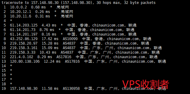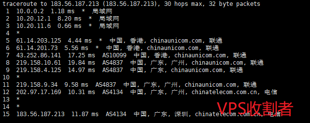 | 跳数 | IP | 地区(仅供参考) | AS号(仅供参考) | 时间(毫秒) |