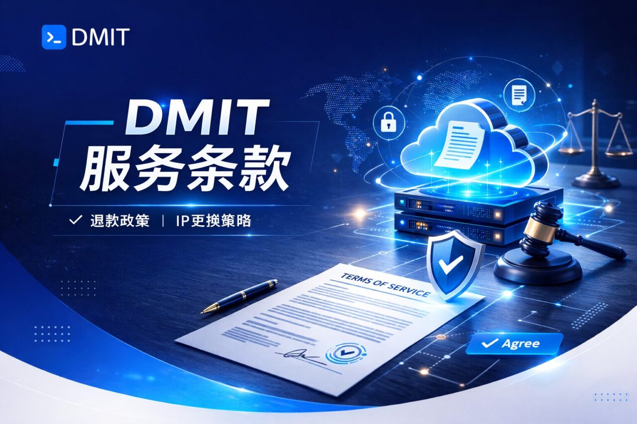 请仔细阅读以下托管服务条款与条件。通过订阅DMIT服务,您同意受本协议("协议")所有条款和条件的约束。如果您同意本协议的条款和条件,请点击"我接受"(或类似语法)或勾选相应复选框表明您同意受这些条款和条件的约束,并继续账户设置流程。您应打印或以其他方式保存本协议的副本以备将来参考。DMIT仅在您同意受本文包含的所有条款和条件约束的情况下才同意向您提供服务。您对本协议的电子接受是依据《全球和国家商务电子签名法》(E-SIGN法案)及类似的联邦和州法律允许的。任何使用DMIT服务的行为均应构成对当前托管服务条款和条件的接受。